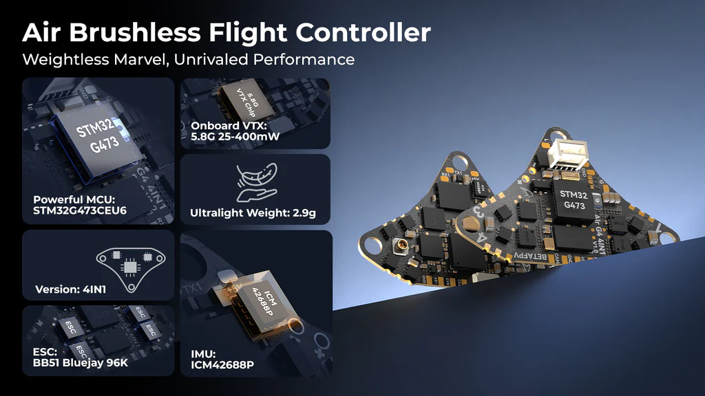 Ważący zaledwie 21g, oferuje ekscytujące i zwinne wrażenia z latania. Air Brushless Flight Controller (4IN1) to pierwszy kontroler lotu 1S, który wykorzystuje procesor G473 o większej mocy obliczeniowej i jest wyposażony w żyroskop ICM42688P. To kompleksowe rozwiązanie integruje FC, ESC, OSD i wbudowany VTX 5.8G 25mw~400mw, a nawet oferuje opcjonalny odbiornik ELRS, ważący jedynie 2.9g.